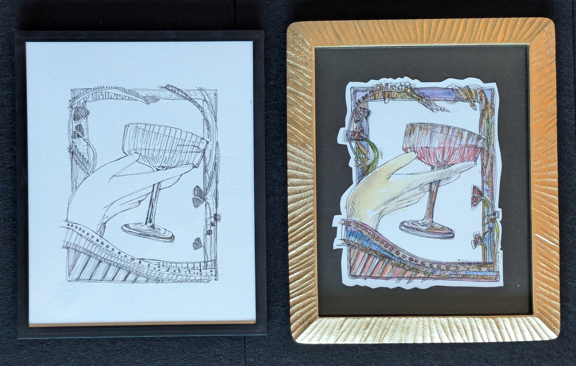2. watercolor painting with pen and graphite drawing on watercolor paper (roughly 6”x8” image), cut and mounted on black paper, varied sized gold frames.