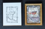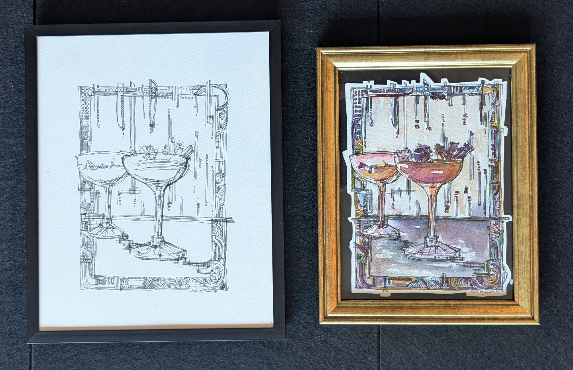 2. watercolor painting with pen and graphite drawing on watercolor paper (roughly 6”x8” image), cut and mounted on black paper, varied sized gold frames.