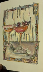 Artwork is part of the “Celebration Series” inspired by celebrations and raising a glass, with details and framing drawing inspiration from Art Deco and Art Nouveau motifs. Each image has two original versions-