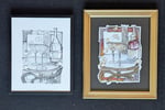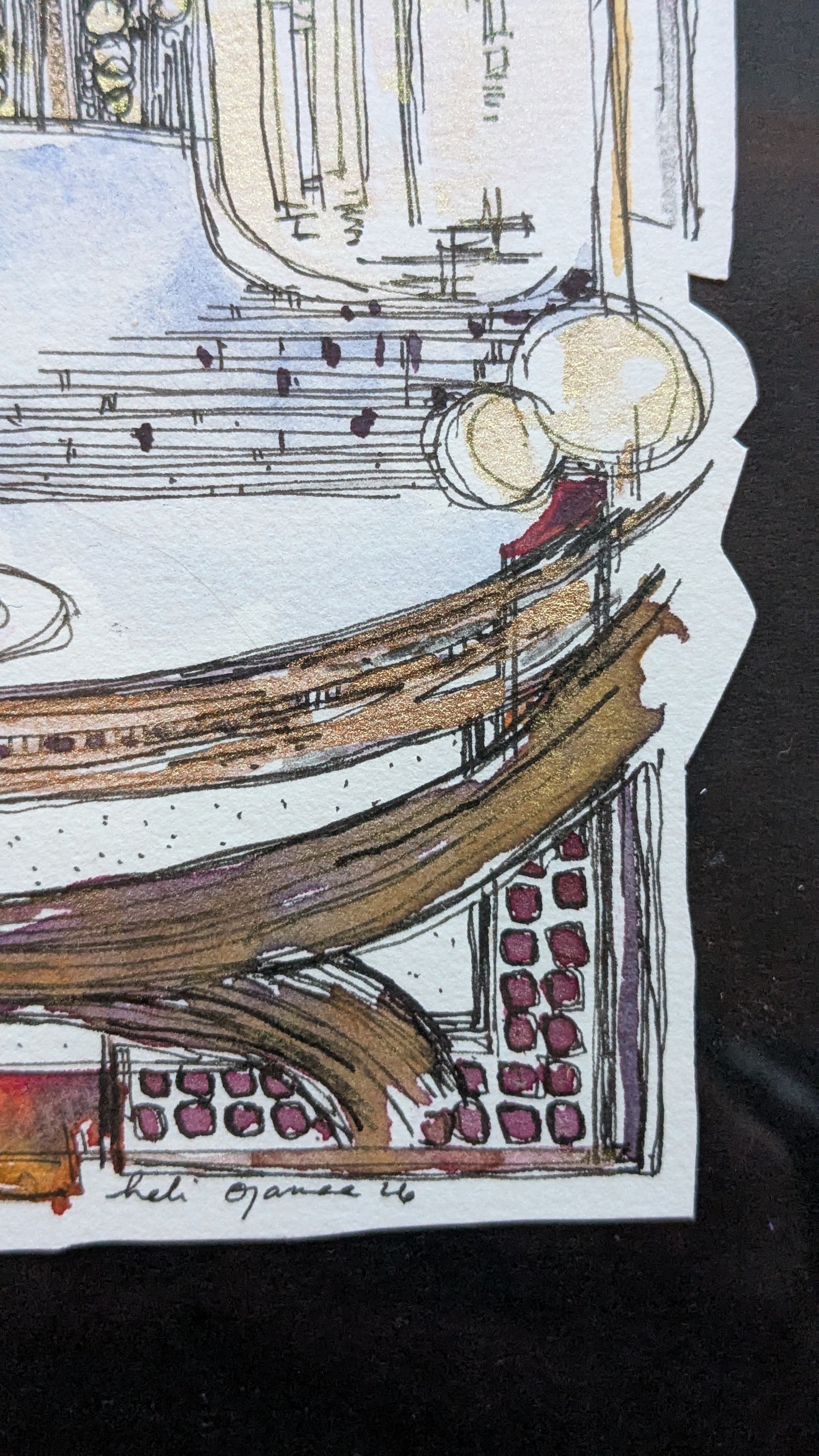 2. watercolor painting with pen and graphite drawing on watercolor paper (roughly 6”x8” image), cut and mounted on black paper, varied sized gold frames.