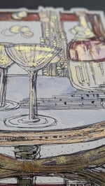 Artwork is part of the “Celebration Series” inspired by celebrations and raising a glass, with details and framing drawing inspiration from Art Deco and Art Nouveau motifs. Each image has two original versions-
